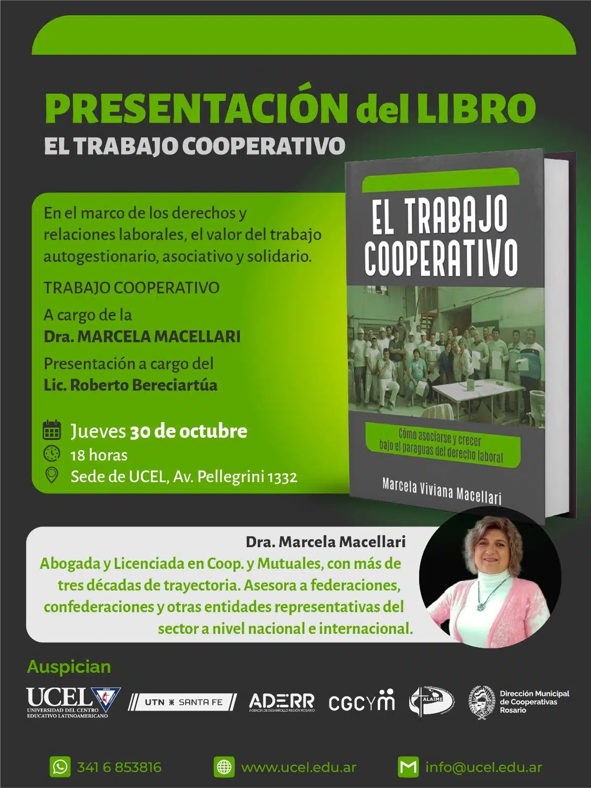 UCEL te invita a participar de la presentación del libro “El trabajo cooperativo. Cómo asociarse y crecer bajo el paraguas del derecho laboral”, de la Dra. Marcela Mascellari.